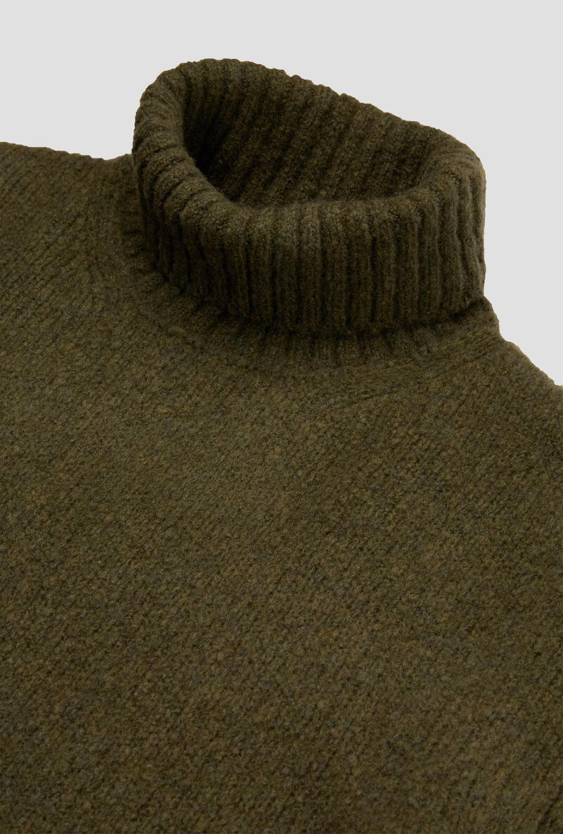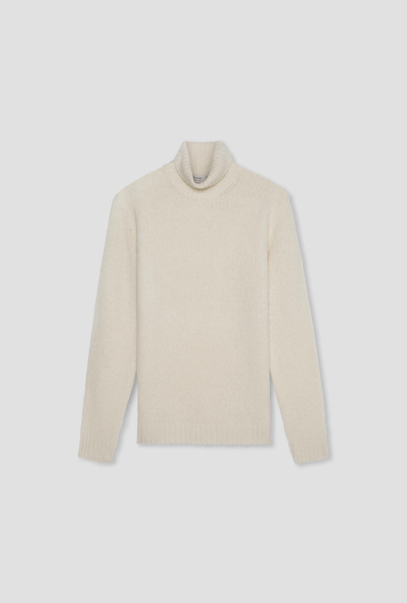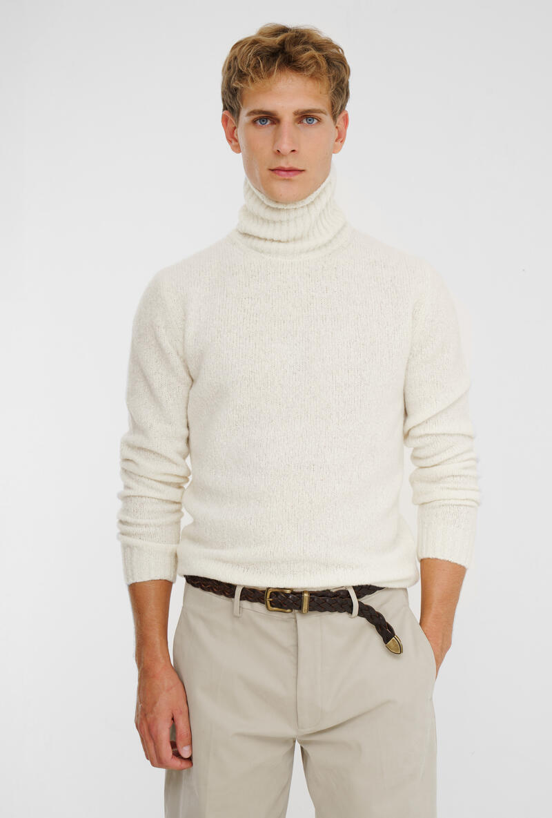 Maglia dolcevita realizzata in un esclusivo filato malfilè, che unisce la morbidezza del cashmere, la leggerezza della lana e la resistenza del nylon. L’aspetto volutamente irregolare del filato conferisce al capo un carattere vissuto e contemporaneo, perfetto per uno stile disinvolto ma ricercato. Il collo alto aggiunge una nota sofisticata e calda, rendendolo ideale per affrontare la stagione fredda con stile. Un pezzo trasversale, adatto sia in contesti casual che sotto giacche destrutturate.