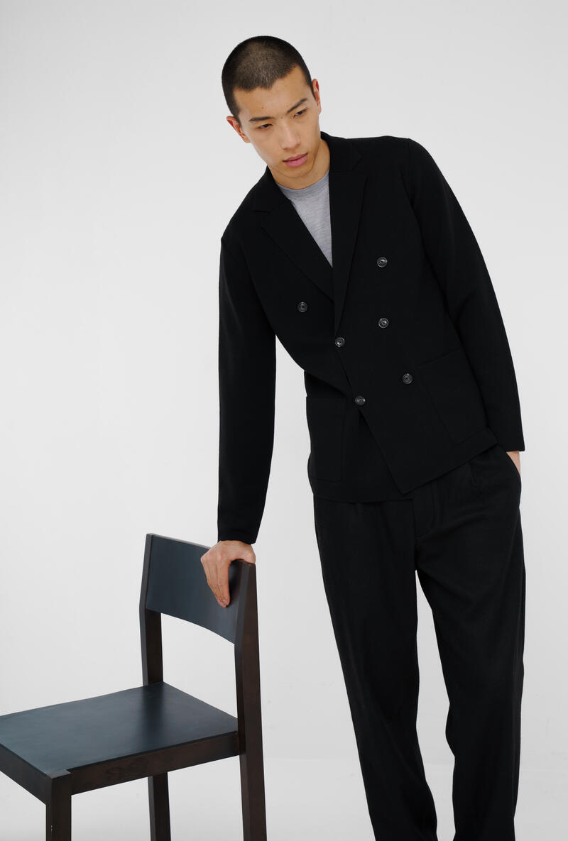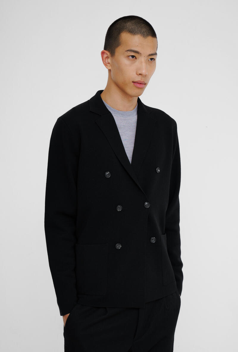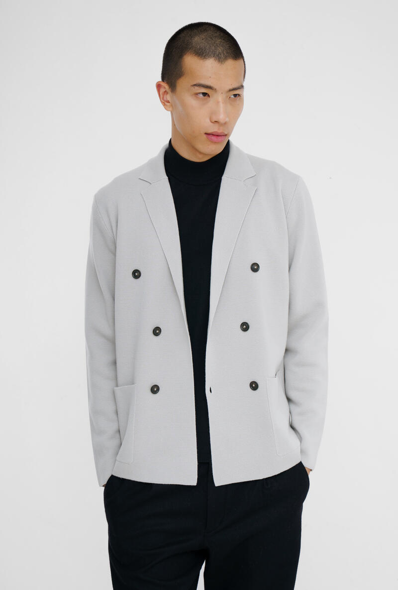 Doppiopetto in maglia che fonde eleganza formale e comfort quotidiano. La lavorazione a punto stoffa valorizza la texture e aggiunge un tocco sobrio e raffinato. Il taglio moderno e destrutturato lo rende ideale per uno stile versatile e contemporaneo.
