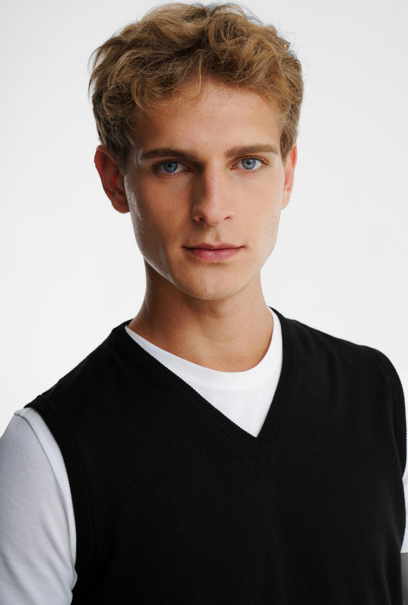 Linee essenziali e una lavorazione raffinata per un Linee essenziali e una lavorazione raffinata per un gilet dallo stile intramontabile, perfetto per completare look a strati con eleganza e praticità. Realizzato in filato di pura lana, assicura calore e morbidezza, rendendolo ideale per la stagione fredda senza rinunciare alla leggerezza. Il design con scollo a V e bordi a costine dona al capo un aspetto sobrio ma distintivo, facilmente abbinabile sia a camicie che a dolcevita, per outfit formali o casual.