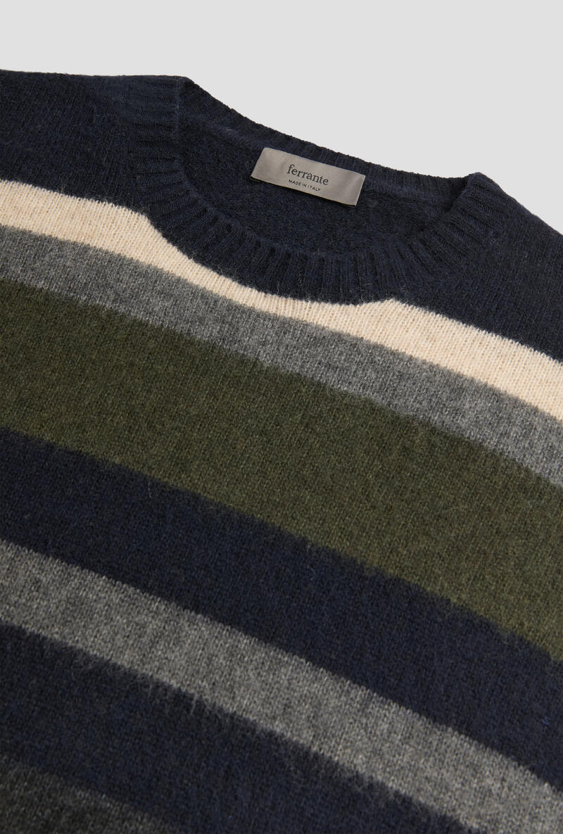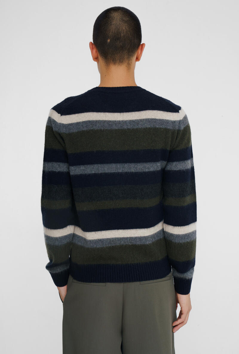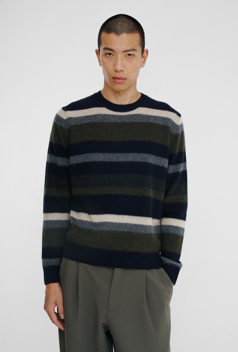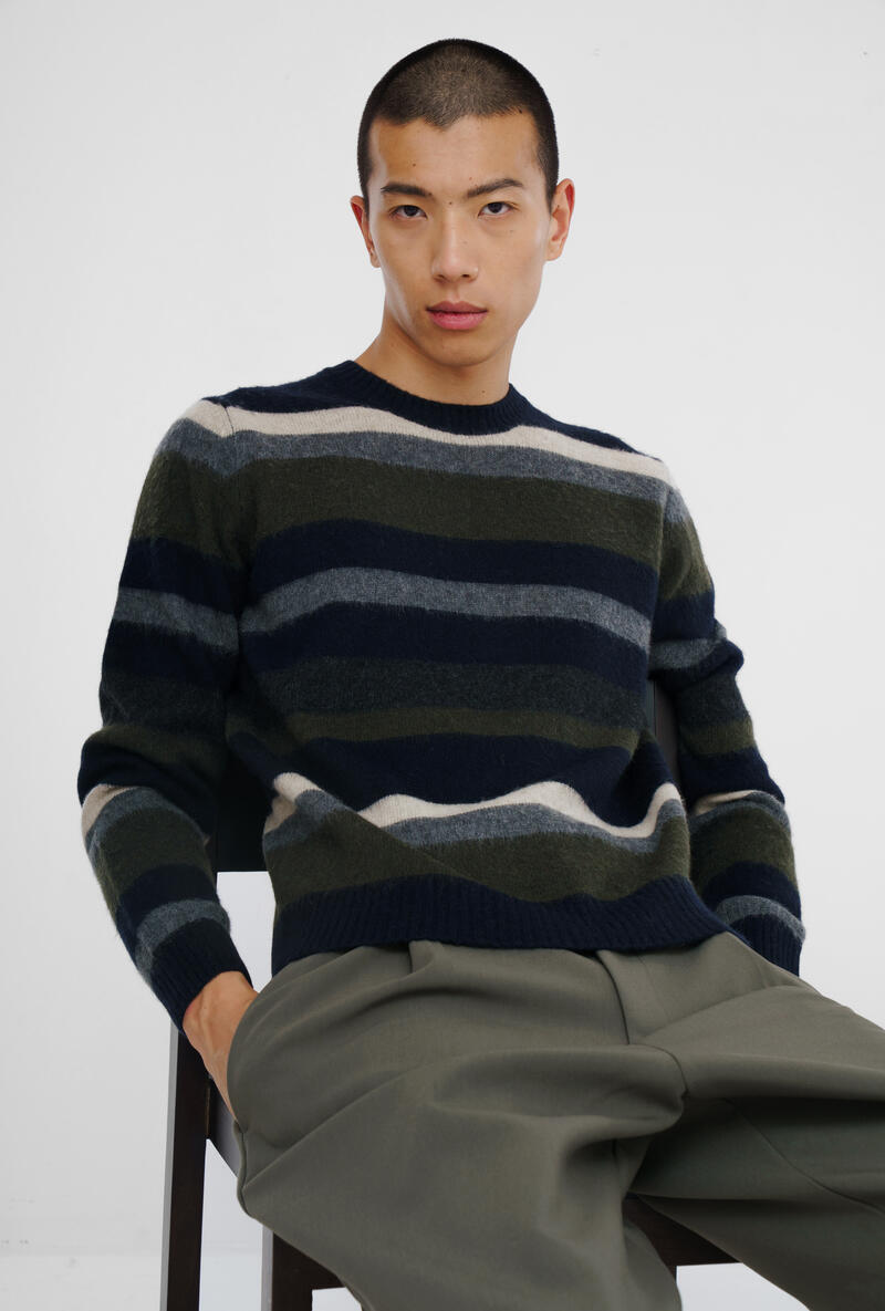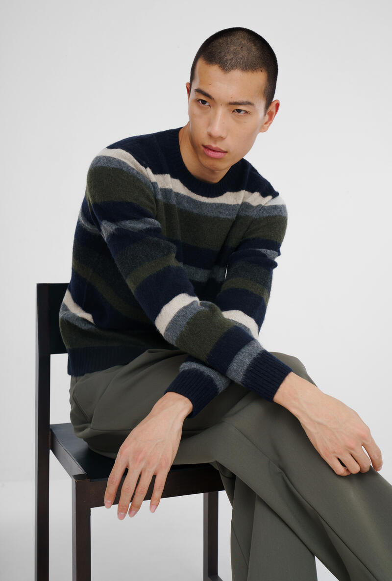Una maglia girocollo contemporanea con righe nei toni naturali, sobria e raffinata. La texture soffice e la vestibilità regolare offrono comfort e libertà nei movimenti. Ideale da sola o sotto giacca, completa con eleganza il guardaroba invernale.