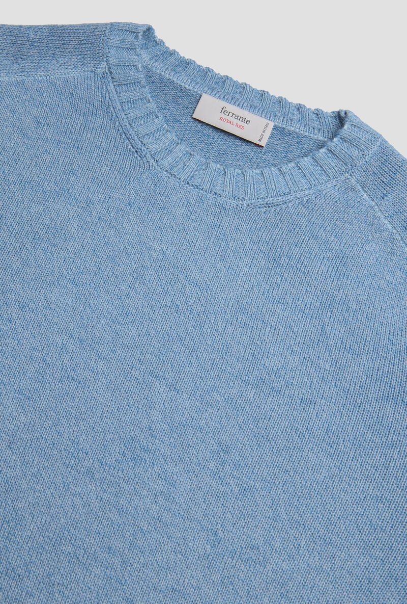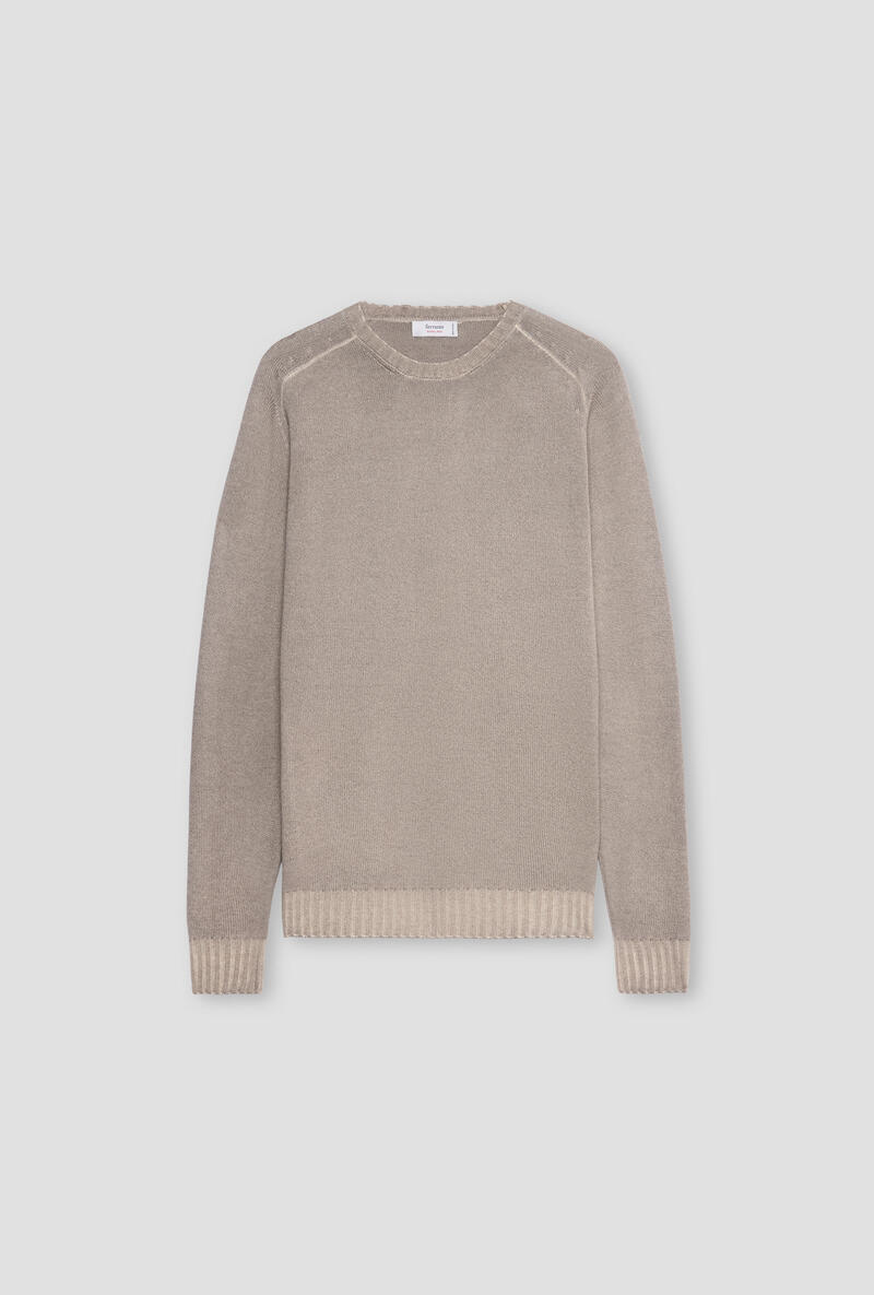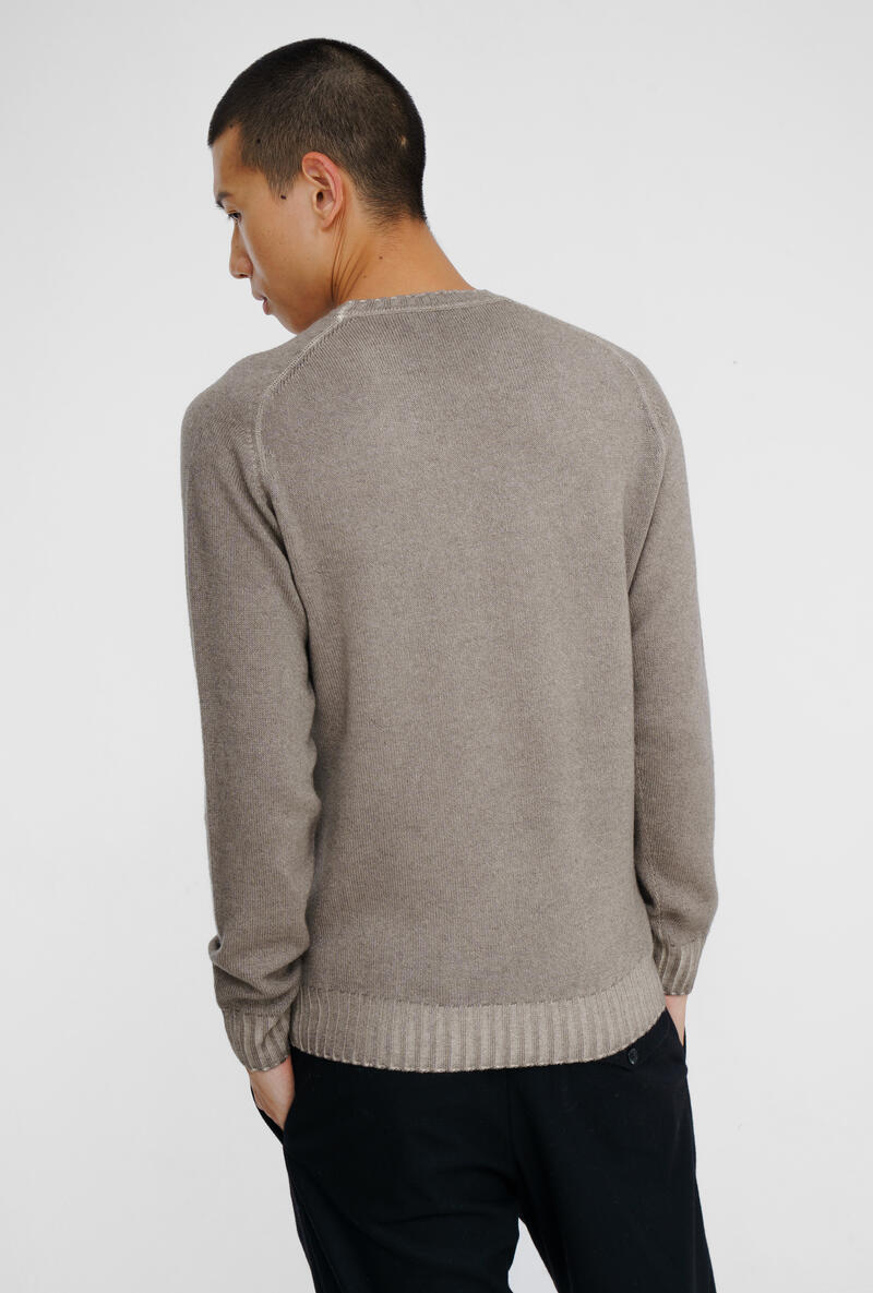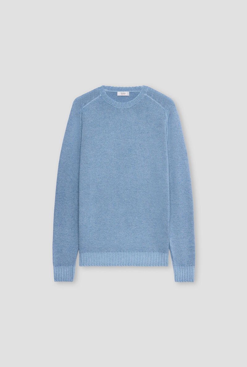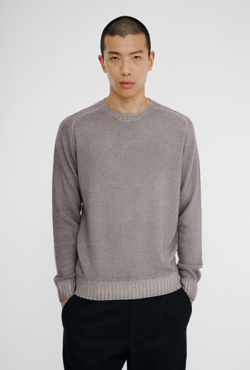 Girocollo in lana,seta e cashmere caratterizzata da una lavorazione tinta in capo che dona al tessuto un effetto cromatico unico, con delicate sfumature che valorizzano la profondità del colore. La mano è morbida, piacevole sulla pelle, ideale da indossare a contatto diretto o sotto giacche e cappotti. Il design è essenziale ma curato nei dettagli: collo a giro classico, polsi e fondo lavorati a costine per una tenuta perfetta, vestibilità regolare che valorizza la silhouette senza costringere.